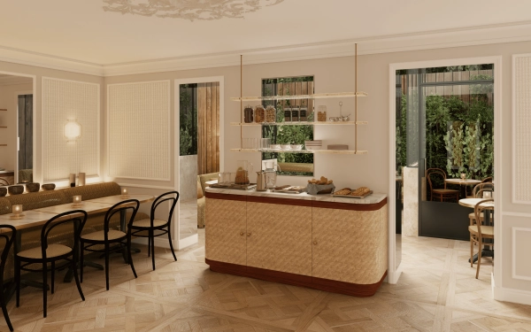 Designed as a cosy townhouse, the Hôtel Almarine Eiffel combines clean lines, natural materials and a palette of warm tones, honey, ecru, cognac, to create a soothing atmosphere.