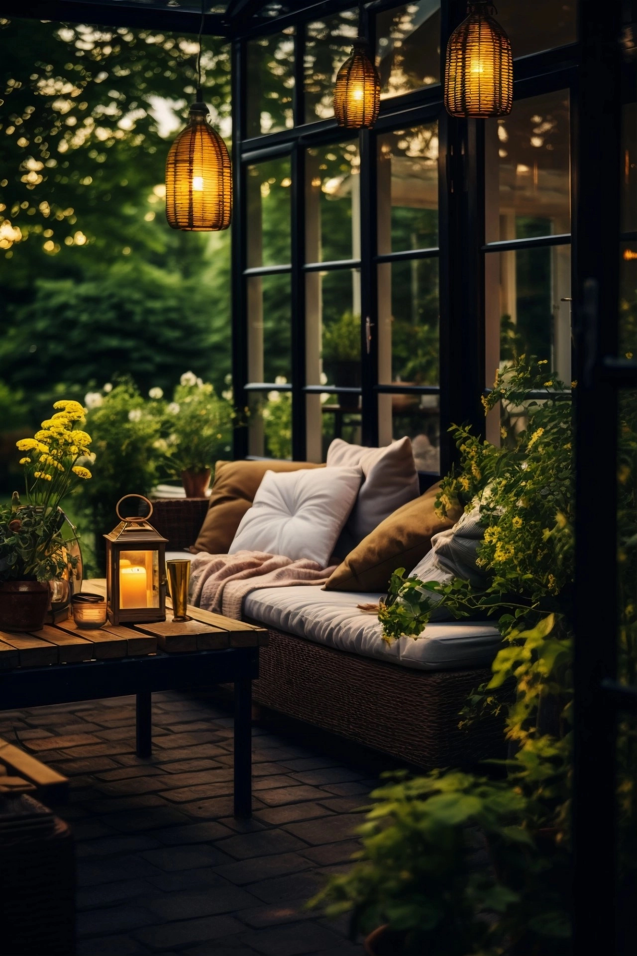 在玻璃穹顶下或石砌庭院中,一片宁静的花园。
